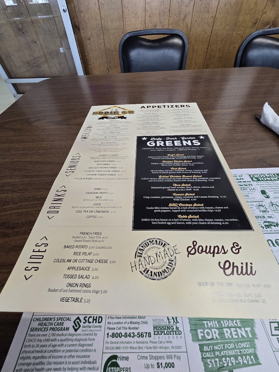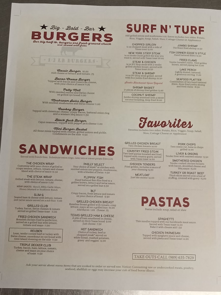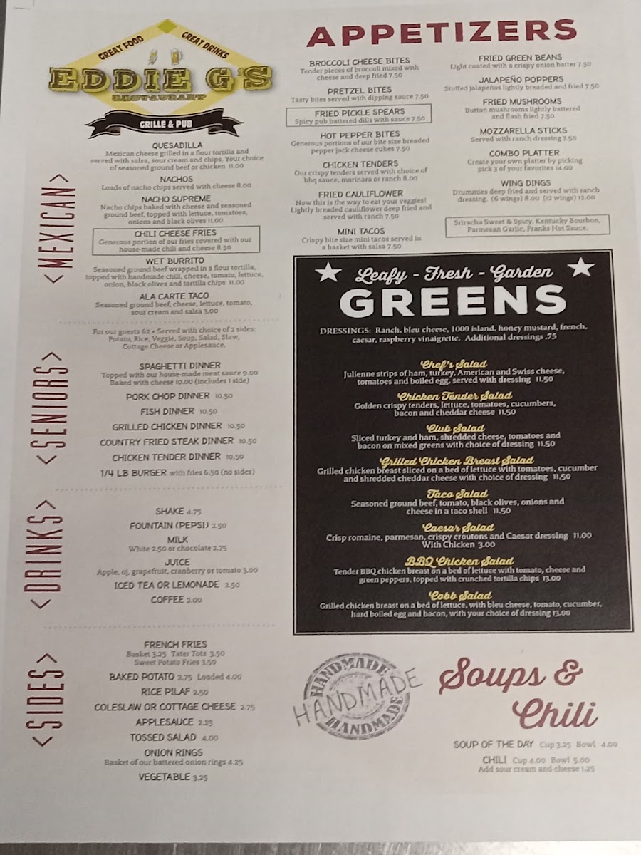 The menu at Eddie G's offers a straightforward selection of classic bar and grill favorites, designed for casual dining in a welcoming, down-to-earth setting. Whether you're stopping by for a hearty dinner or a relaxed lunch, the menu strikes a balance between comforting homestyle meals and satisfying American staples.